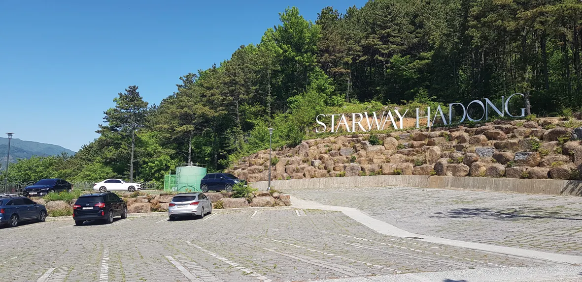 스타웨이하동 주차장, 앞쪽은 스타웨이가 임대한 곳이고 뒤쪽의 넓은 주차장은 주민 누구나 사용할 수 있는 공영주차장이다.