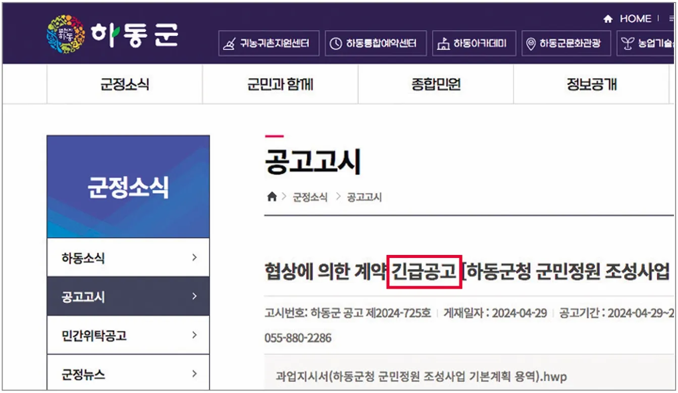 군민정원 조성사업은 하동군청 마당을 정원으로 만드는 사업이다. 그런데 이 사업은 일반 공고가 아닌 ‘긴급 공고’를 통해 추진되고 있다. 하동군 관계자는 그 이유를 “경제위기 극복을 위한 기획재정부의 계약 지침과 지방계약법 시행령에 따라 국가 재정정책 상 예산의 조기집행을 위해 필요한 경우에 해당한다.”고 밝혔다.