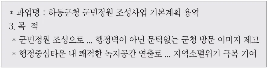하동군청은 군민정원 조성사업의 목적을 다음 두 가지로 밝히고 있다.