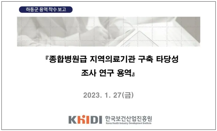 최근 하동군은 ‘하동군 종합병원급 지역의료기관구축 타당성 조사 연구용역’ 착수보고회를 열었다. 이번 용역은 하승철 하동군수의 공약사항인 종합병원급 공공보건의료원 설립을 위한 타당성 조사이다. 본 조사에서는 경상남도를 5개 권역으로 나누고 하동을 진주, 산청, 사천, 남해와 함께 진주권역에 포함시켰다. 인구구조, 의료기관 현황, 병상 수, 의료인력 현황, 취약지역 분석, 응급의료기관 접근 기준시간 등 지역의 특성을 반영하여 하동군 실정에 맞는 의료기관을 제안하는 것을 목표로 하고 있다.