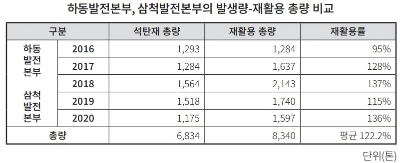 하동화력발전소에서는 유연탄을 보일러에서 태워 발전을 하고 있는데, 연소 후 남는 물질을 석탄재(석탄회)라고 한다. 석탄재는 다시 플라이애쉬(Fly Ash)라고 하는 비회(비산재)와 버텀애쉬(Bottom Ash)라고 하는 저회, 그리고 탈황석고로 나뉜다. 매년 100만 톤이 넘는 석탄재와 탈황석고가 발생하고 있는데 그중 석탄재 발생량과 재활용률은 다음과 같다.