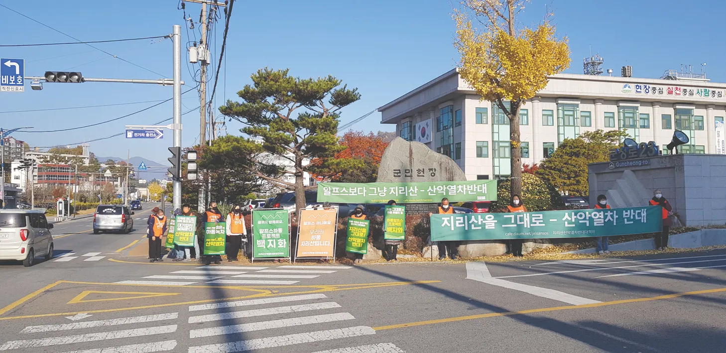 하동군청 앞어서 산악열차 반대 시위 중인 주민들