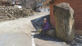 할머니 한 분이 마을 어귀에 앉아계시다.