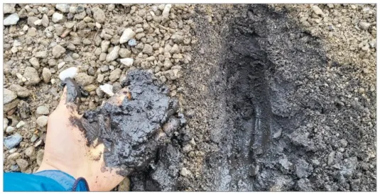 [사진2] 자갈로 덮어놓은 곳을 조금만 파면 폐주물사와 침출수를 확인할 수 있다.