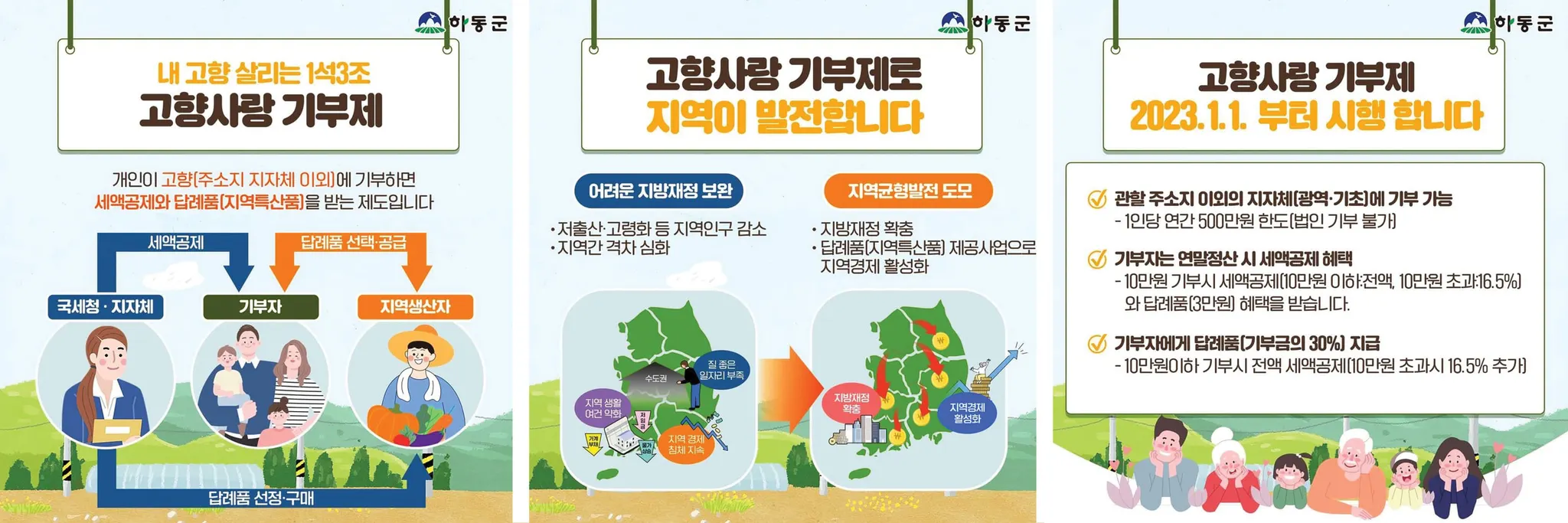 2023년 1월 1일부터 고향사랑기부제(고향세)가 시행된다. 2021년 10월에 법률이 제정되었으며, 지난 9월 7일 ‘고향사랑기부금에 관한 법률 시행령 제정안’이 의결되었다. 그 전후로 전국 243개 지자체가 앞다투어 이 제도에 대해 홍보에 열을 올리기 시작했다. 하동군 페이스북 공식 페이지에서도 최근 홍보물이 게시되었다.
