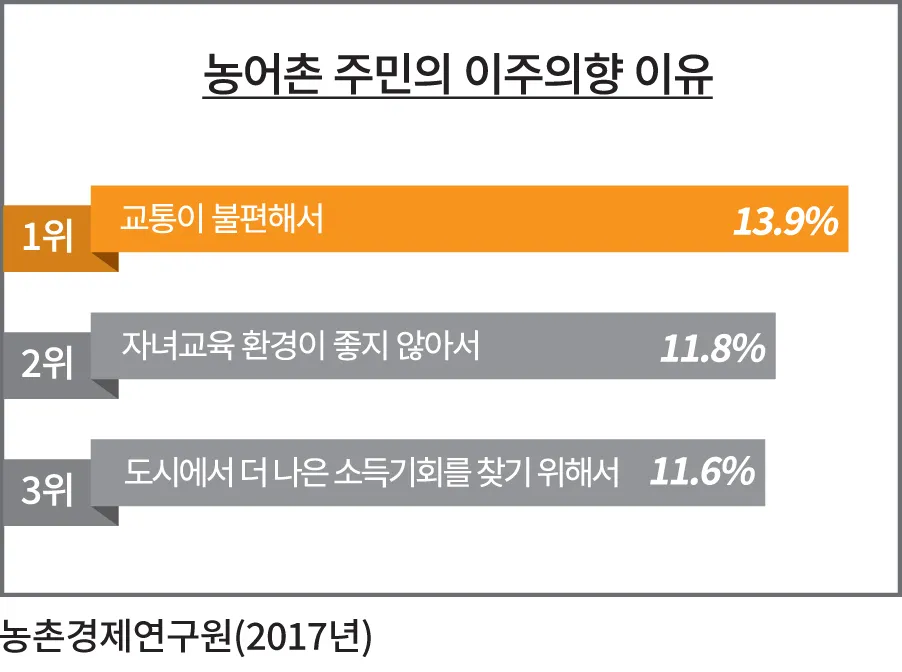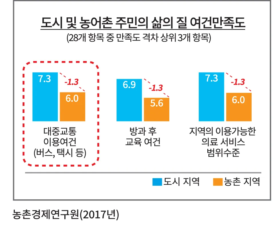 문제는 군민들의 이동권이 제약되면서 나타나는 일상생활의 불편만이 아니다. 해당 지역 주민의 원활한 경제활동이 제한되면서 지역 경제의 침체나 지역 쇠퇴의 한 원인으로까지 작동하게 된다. 실제로 2017년 농촌경제연구원의 조사에 따르면 농촌주민이 도시로의 이주를 고민하는 이유로 ‘교육과 소득, 의료불만족’을 넘어서 ‘교통 불편’이 1위를 차지했다.
