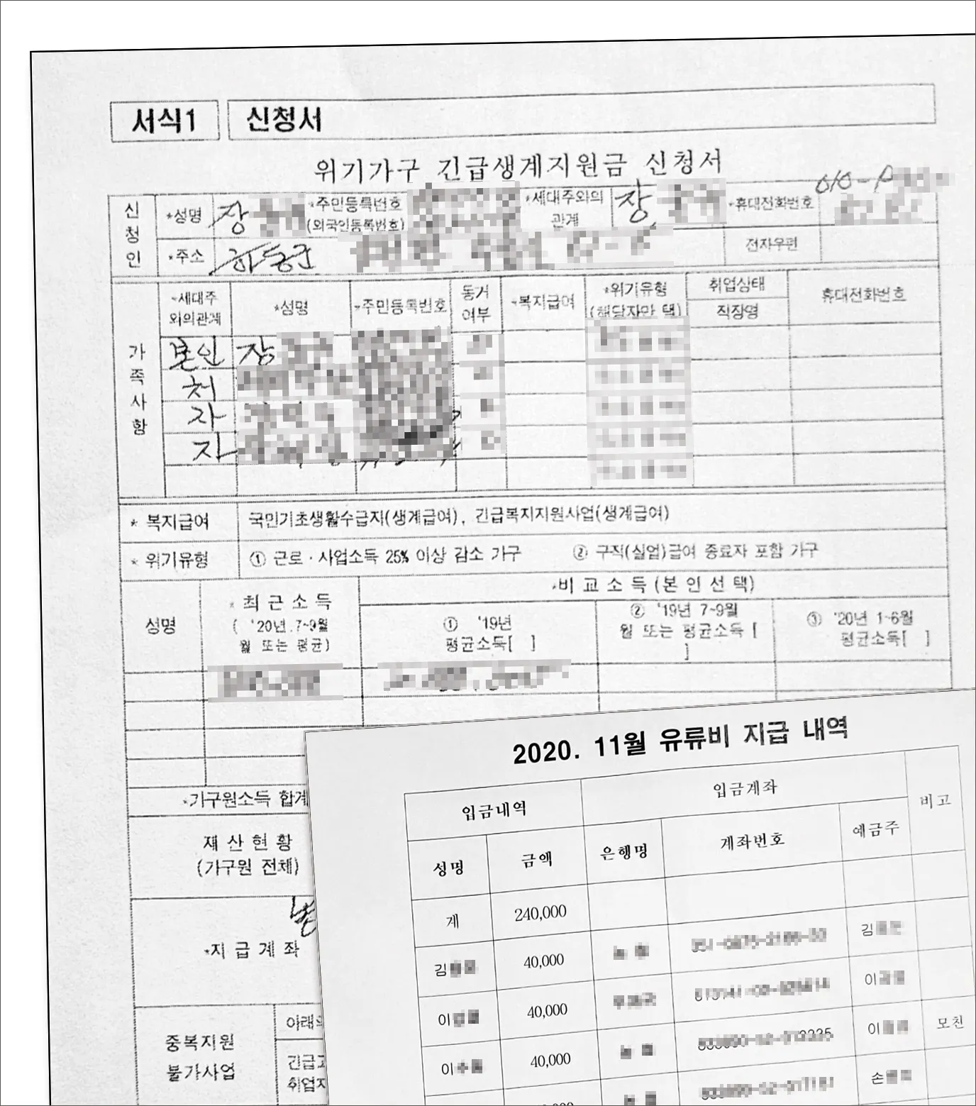가족의 신상정보가 적힌 <긴급생계지원금 신청서>