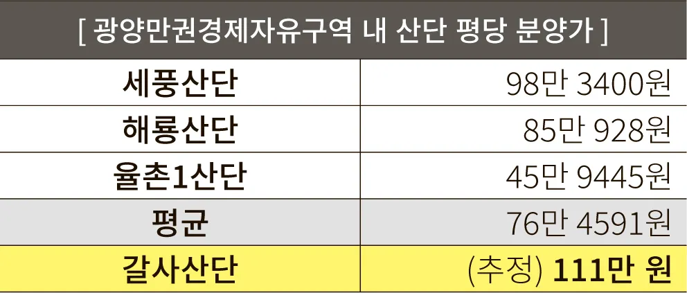 갈사산단의 평당 분양가 111만 원(추정)을 광양만권 내 산단 평균 분양가인 76만 원과 비교 해보았을 때, 과연 이 사업의 경제성을 찾을 수 있을지 의문이다. 사업자는 사업을 할 때 이윤만을 목적으로 한다. 이 계획대로 산단 개발을 무리하게 추진하다가 하동지구개발사업단 때처럼 모든 책임을 하동군이 다 뒤집어쓸 가능성은 없는지 잘 살펴보아야 할 때이다.