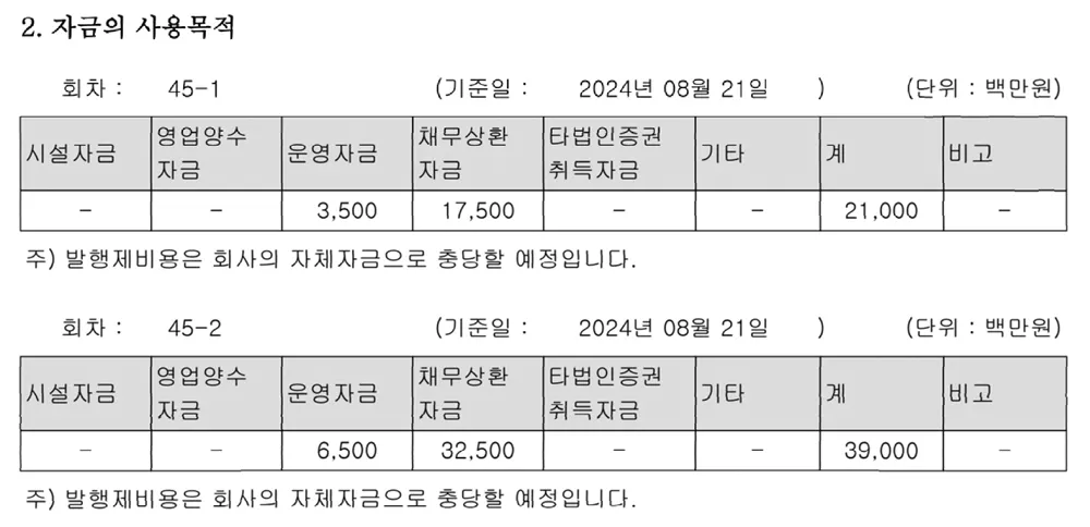 [자료1] 한국토지신탁이 공시한 투자설명서(2024. 8. 28) 이 설명서에 따르면 운영 및 채무상환 자금만 들어있을 뿐 갈사 산단 투자에 대한 계획은 보이지 않는다.