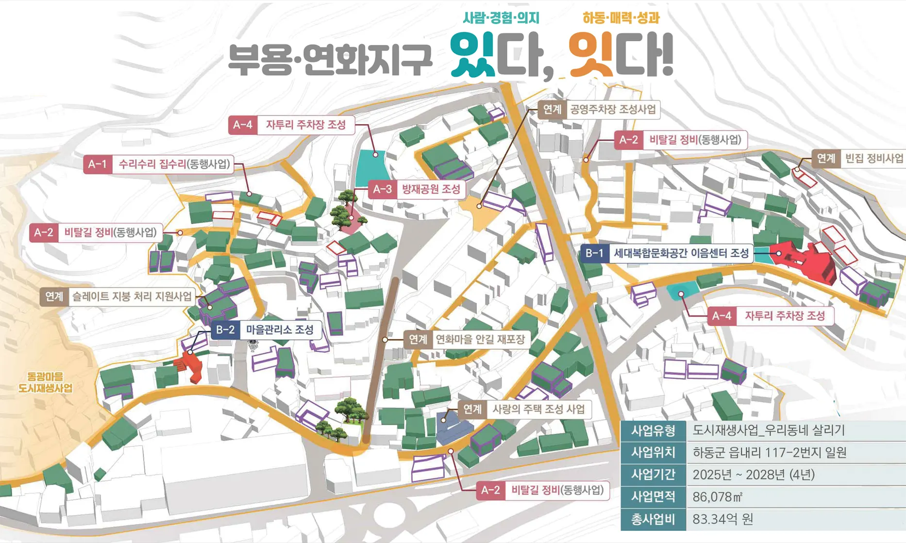 2025~2028년에 걸쳐 하동읍 부용·연화지구에는 하동군의 4번째 도시재생사업이 진행될 예정이다. 이 사업은 2020년에 완료된 광평마을 ‘우리동네 살리기’와 같은 유형으로 83억 원의 예산이 투입되는데, 지방소멸대응기금 101억 원이 투입되는 하동청년타운 조성과 연계되어 총사업비는 193억이 넘는다. 이미 3차례나 비슷한 유형의 사업을 진행한 바가 있으므로 부용·연화지구는 예전의 사업경험을 바탕으로 ‘주민주도형’이라는 본래의 사업취지를 살려 좀 더 바람직한 방향으로 사업이 개선되어야 마땅하다. 그러나 현실은 그렇지 못하다.
