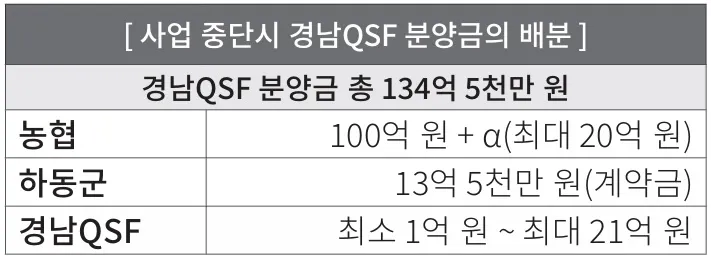 하동군은 최악의 경우에도 손해가 없다고 한다. 만약 사업이 중단되어 농협에 120억 원을 돌려줘야 하더라도 분양계약서에 따라 분양금의 10%(계약금)인 13억 5천만 원을 제외한 나머지 1억 원만 경남QSF에 돌려주면 된다는 것이다. 적어도 계약금 13억 5천만 원은 챙길 수 있다는 것이다.
