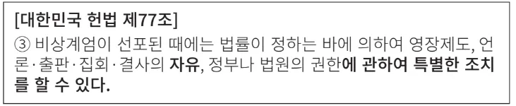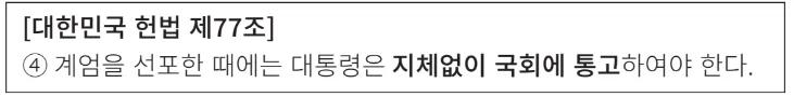 하지만 대한민국은 자유민주주의 국가입니다. 자유민주주의 국가가 추구하는 최고의 목표는 국민의 자유를 보장하는 것입니다. 그래서 국민의 자유를 제한하는 계엄 선포는 반드시 ‘국회 동의’를 얻으라는 절차를 마련한 것입니다.