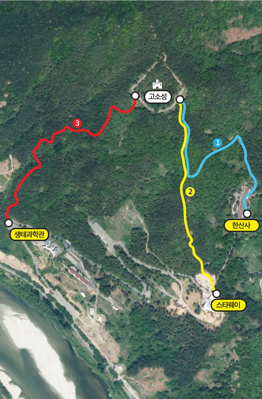 [그림 3] 1 한산사→고소성, 2 스타웨이→고소성, 3 지리산생태과학관→고소성의 3개의 탐방로 비교