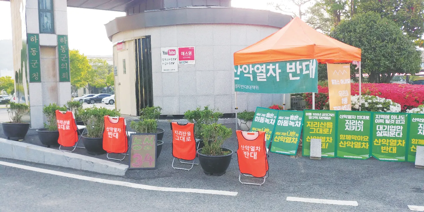 3월 14일 기자회견으로 시작한 지리산 산악열차반대 대책위(이하 대책위)의 알프스하동프로젝트(산악열차사업) 백지화 천막농성이 한 달 넘게 이어지고 있다.