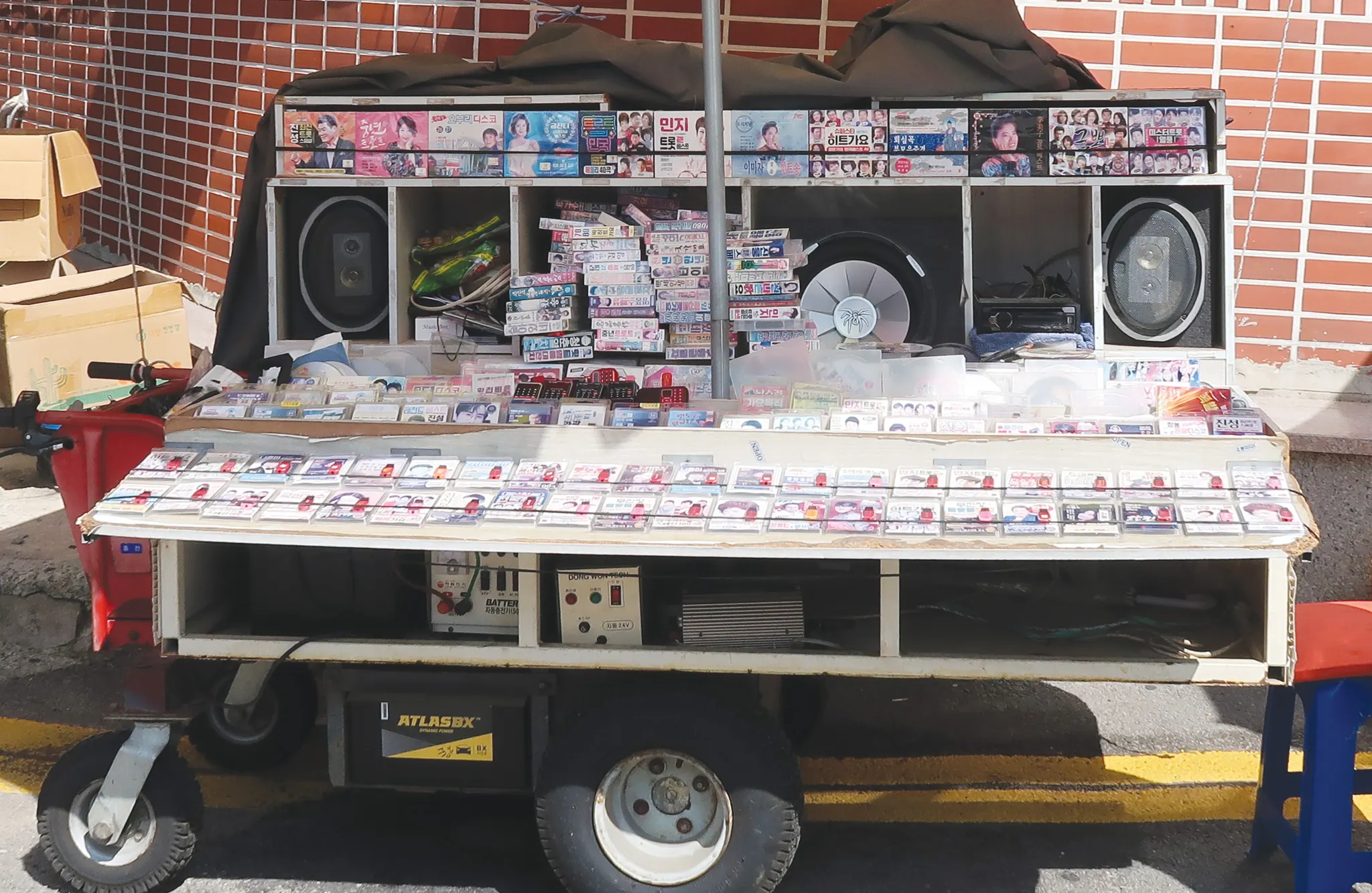 답 : 그때 IMF 전에. 그때는 USB 없고 테이프하고 CD도 간혹가다 하나씩 나오고, 제대로 박스(Box)든 거 그거 하나씩 나오고, 그 담에는 전부 복사판, 테이프도 복사판 그거 다 팔 때라. 그래갔고 많이 팔렸지. 저 진해 군항제 같은 데 가서 보면, 그때는 음악 세계라, 좋아~. 지금은 그거이 없어. 옛날에 관광지 같은 데 가믄 여자들 아주 신이 나제. 음악 쫌 쎄게 빠른 거좀 틀어주면 아주 좋아한당께.
