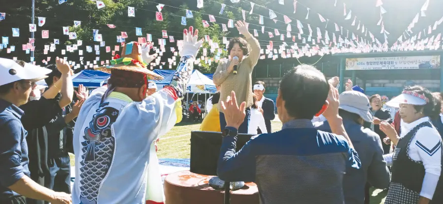 10월 14일 금요일 구름 한 점 없는 청암공설운동장 파란 가을하늘에는 면민 체육대회를 알리는 만국기가 휘날리고 있었다. 화합 한마당 축제를 겸한 체육대회에는 500여 청암면민들이 코로나로 닫혀있던 대문을 박차고 나온 듯 넓은 운동장을 가득 채웠다.