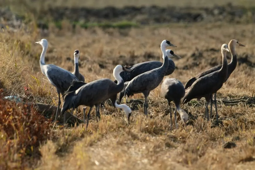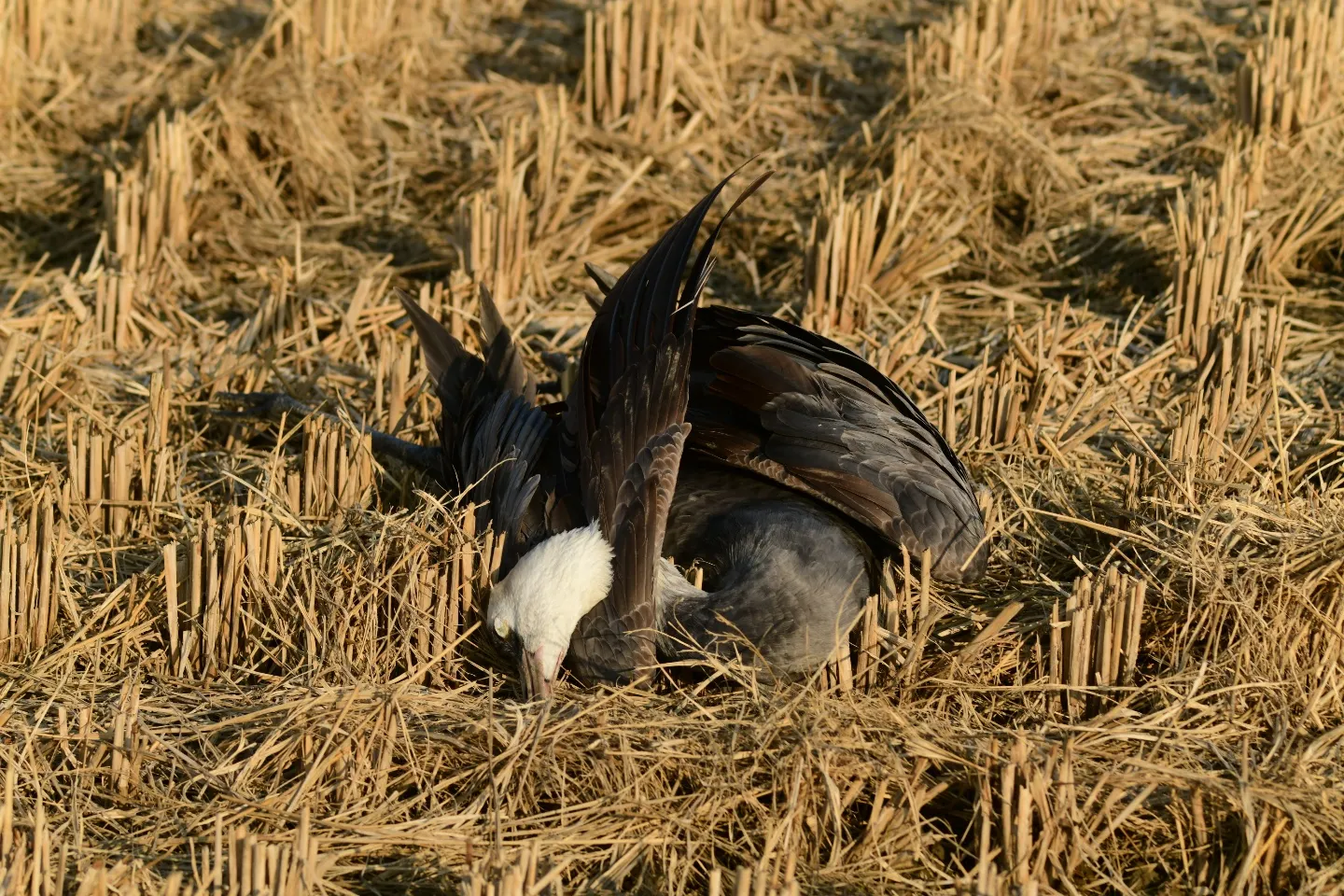 농경지에서 먹이활동을 하고 있는 흑두루미