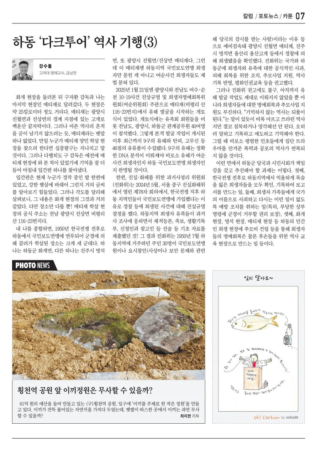 한편, 진실·화해를 위한 과거사정리 위원회(진화위)는 2024년 5월, 서울 중구 진실화해위에서 열린 제78차 회의에서, 한국전쟁 직후 하동 지역민들이 국민보도연맹에 가입했다는 이유로 경찰 등에 희생된 사건에 대해 진실규명 결정을 했다. 하동지역 희생자 유족들이 과거사 조사에 응하면서 제적등본, 족보, 생활기록부, 신청인과 참고인 등 진술 등 기초 자료를 제출했던 것! 그 결과 진화위는 1950년 7월 하동지역에 거주하던 주민 30명이 국민보도연맹원이나 요시찰인(사상이나 보안 문제와 관련해 당국의 감시를 받는 사람)이라는 이유 등으로 예비검속돼 광양시 진월면 매티재, 진주시 명석면 용산리 용산고개 등에서 경찰에 의해 희생됐음을 확인했다. 진화위는 국가와 하동군에 희생자와 유족에 대한 공식적인 사과, 피해 회복을 위한 조치, 추모사업 지원, 역사기록 반영, 평화인권교육 등을 권고했다.