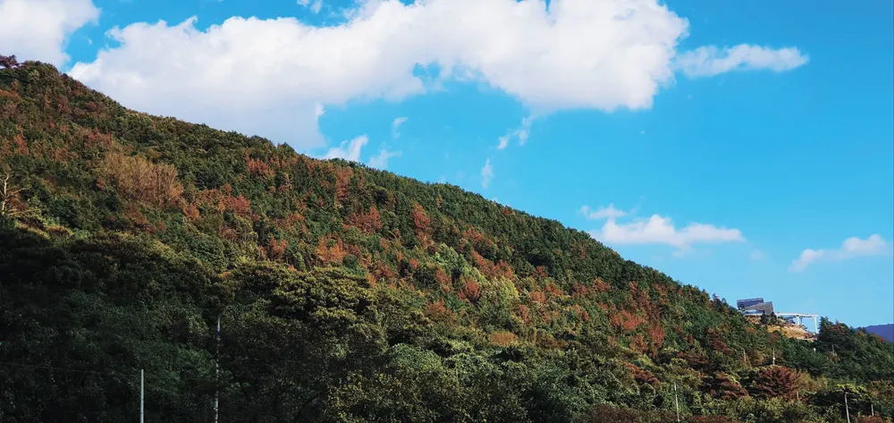 고소성 일대의 소나무가 재선충병에 걸려 말라 죽은 모습이다. 마치 가을에 단풍이 든 것처럼 보인다.
