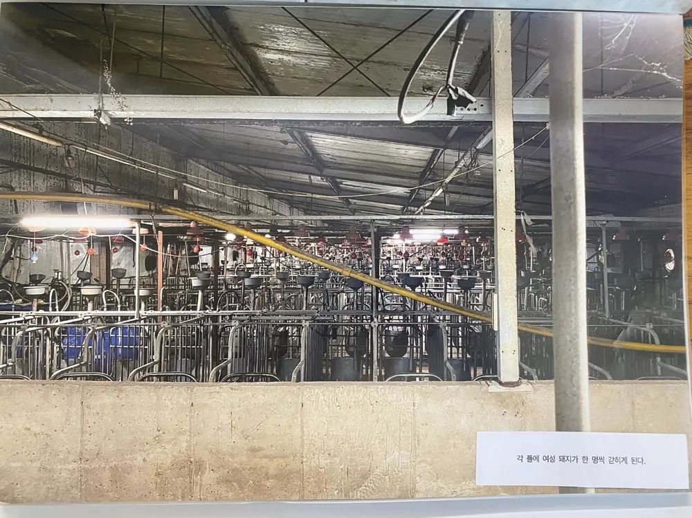 인간에 의해 새끼를 낳도록 정해진 여성 돼지들이 지내야 하는 시설의 모습이다. 각 틀에 여성 돼지가 한 명씩 갇힌다. 새끼가 깔리지 않게 하기 위해 움직일 수 없도록 만든 것이다.