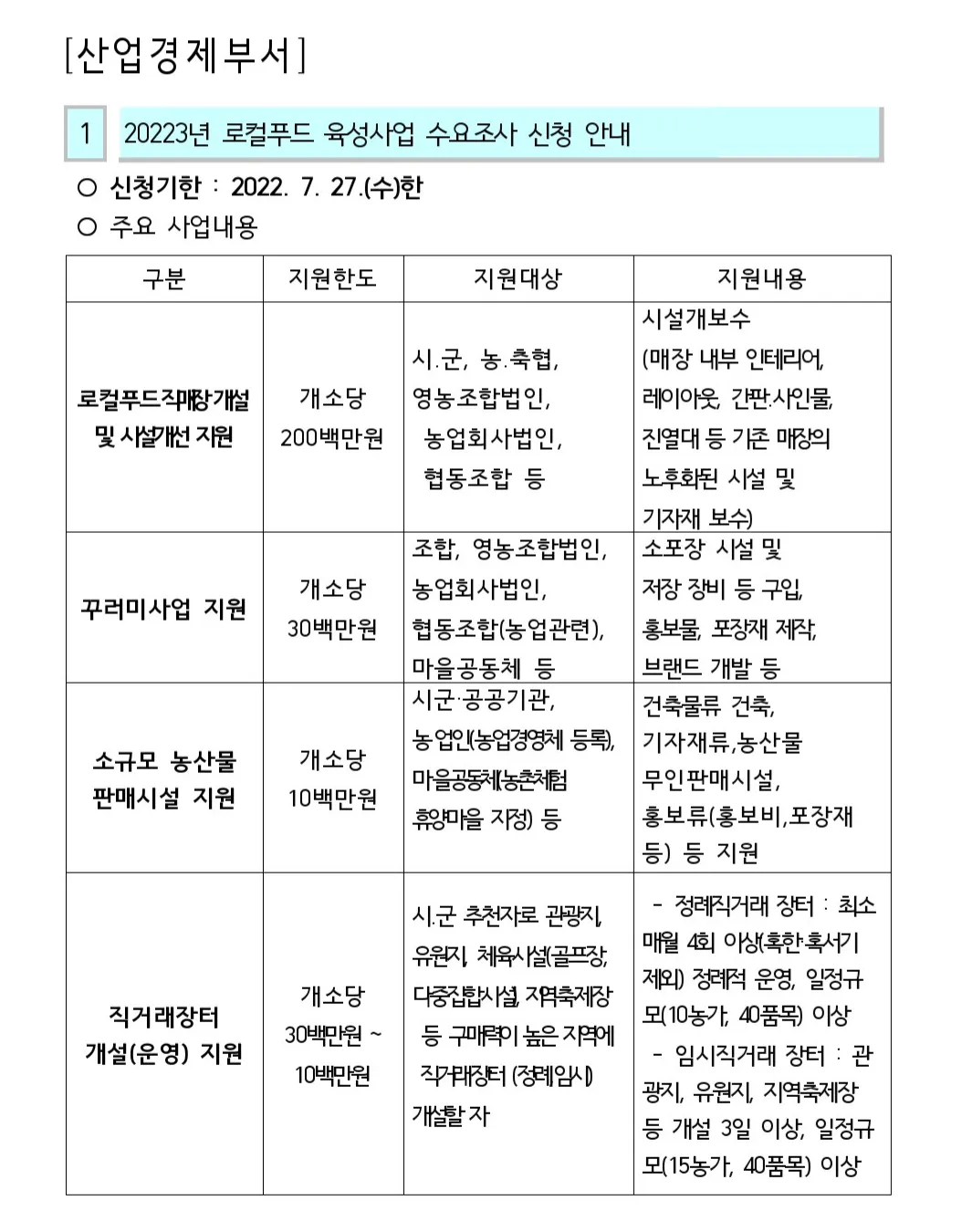 지난 7월 27일까지 신청 기간이 만료되는 ‘2023년 로컬푸드 육성사업 수요조사 신청’이 있었다. 이 신청은 농업인 및 농업단체를 대상으로 하는 수요조사이다. 그 내용은 로컬푸드 직매장 개설 및 시설개선, 꾸러미사업, 소규모농산물 판매시설, 직거래장터 개설(운영)을 사업에 따라 1천만 원에서 2억 원까지 지원하는 규모가 큰 사업이다. 수요조사에 응한 법인과 농민에게 우선권을 부여하기 때문에 수요조사 참여는 지원사업 신청과 버금가는 일이었다. 이런 사업을 계획하거나 진행하는 군민에게는 아주 중요한 지원사업임은 두말할 필요가 없다.