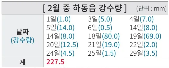하동읍의 강수량은 역대 최고치인 227.5㎜였다. 문제는 단순히 비가 많이 온다는 것이 아니다.비가 ‘꾸준히’ 온다는 것이다. 아래 표를 보면,2월 1일부터 6일까지 6일 동안, 2월 18일부터 25일까지 8일 동안 비가 왔다. 14일과 29일에도 비가 내렸으니, 25일 중 16일 동안 비가 왔다.‘겨울 장마’인 것이다.