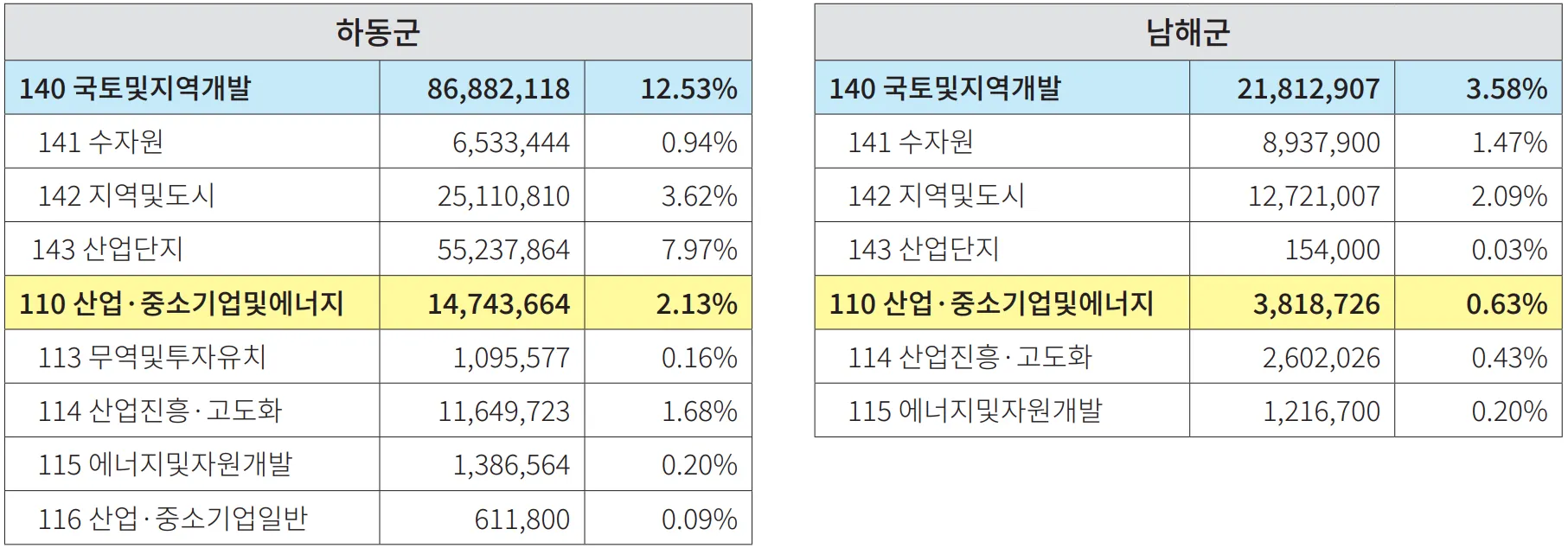 ‘예산규모 2위, 복지예산 비율 꼴찌’라는 하동군의 참담한 현실을 해명할 수 열쇠는 ‘국토 및 지역개발’과 ‘산업·중소기업 및 에너지’ 항목에서 찾을 수 있다.(표2 참고)