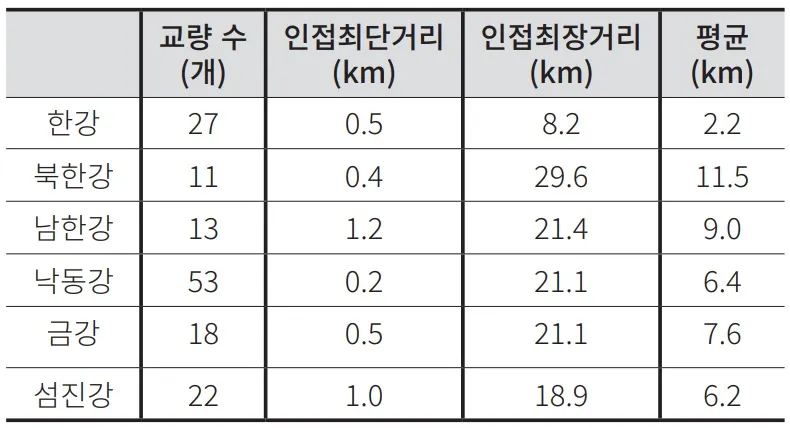 2014년 10월, 국토교통부의 의뢰로 한국교통연구원이 진행한 연구용역 결과 보고서에는 전국 주요 6개 강의 교량 수와 교량 간 인접 최단거리와 최장거리, 그리고 이들의 평균값을 정리한 표가 나온다.