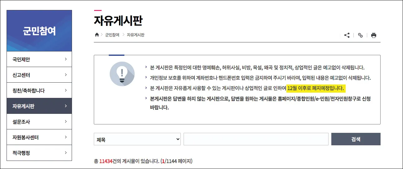 12월 이후 폐지를 예고한 하동군청 홈페이지 자유게시판 (하동군청 홈페이지 캡처)