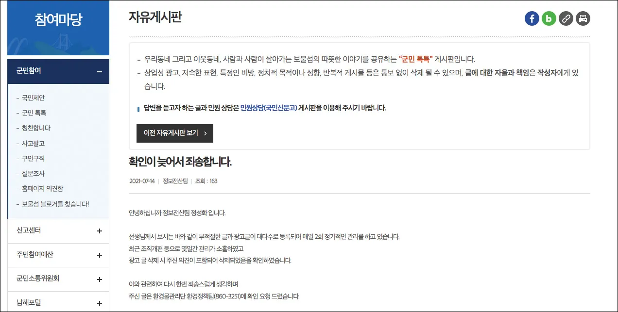 남해군 홈페이지 군민톡톡 게시판 관리자의 글(남해군청 홈페이지 캡처)