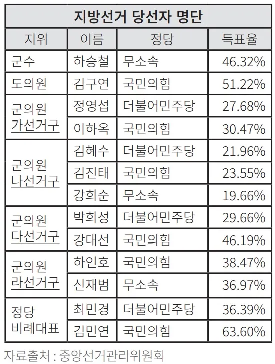 군의원 비례대표를 뽑는 정당득표율은 더불어민주당 36.39%, 국민의힘 63.60%로 국민의힘이 압도적이다. 정당득표율과 군수후보의 득표율을 따져보면 군수는 인물선거였음이 분명해진다. 두 거대 양당의 후보들은 정당지지율의 절반 정도의 득표에 그쳤다. 더불어민주당 지지자 중 21%와 국민의힘 지지자 중 25%가 무소속 후보를 지지한 것이다. 두 거대 양당의 지지율 차이는 여전하지만 지지자의 상당수가 이탈했다는 점은 커다란 변화이다.