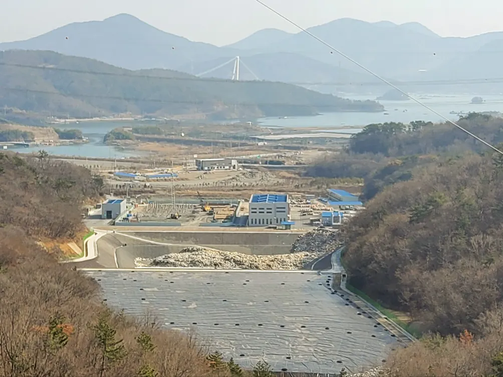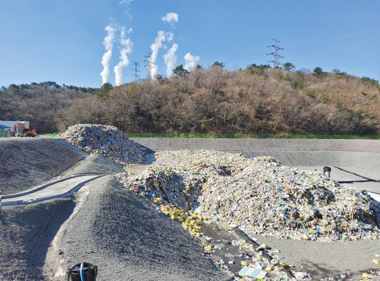 제2생활폐기물처리장을 멀리서 내려다보았다. 시커먼 비닐로 덮여 있는 부분이 있고, 시멘트로 포장된 거대한 구덩이에 쓰레기들이 어지럽게 모여 있다.