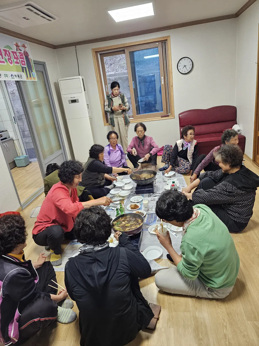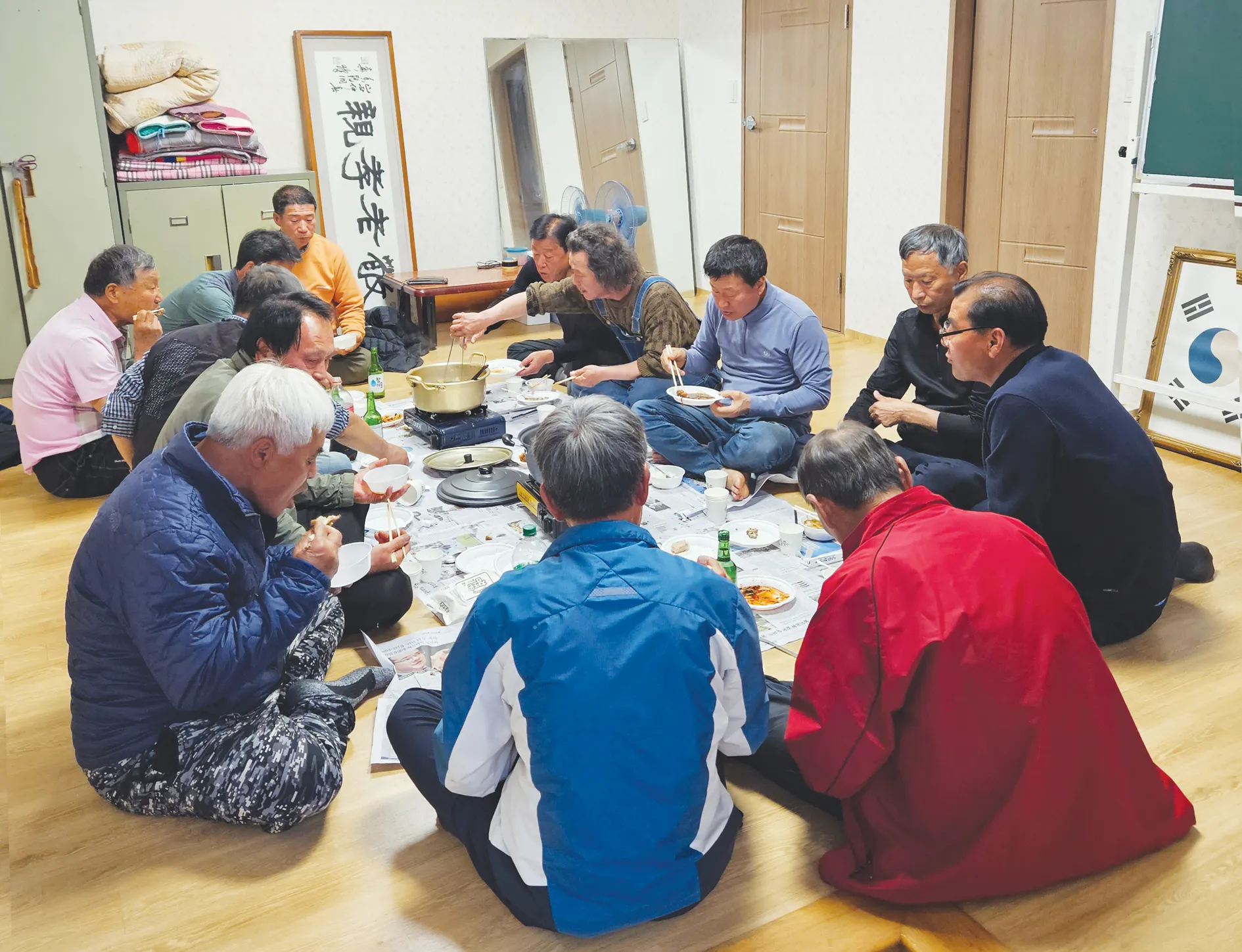 마을공동급식으로 점심을 먹고 있는 심답마을 주민들