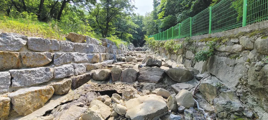 사방사업 시행 이후, 2023년 7월 현재의 떼방골이다. 큰 암반과 바위는 사라지고 계곡 가장자리에 축대가 들어섰다. 직선화된 계곡은 많은 비가 오면 물이 더 빠른 속도로 흐른다.