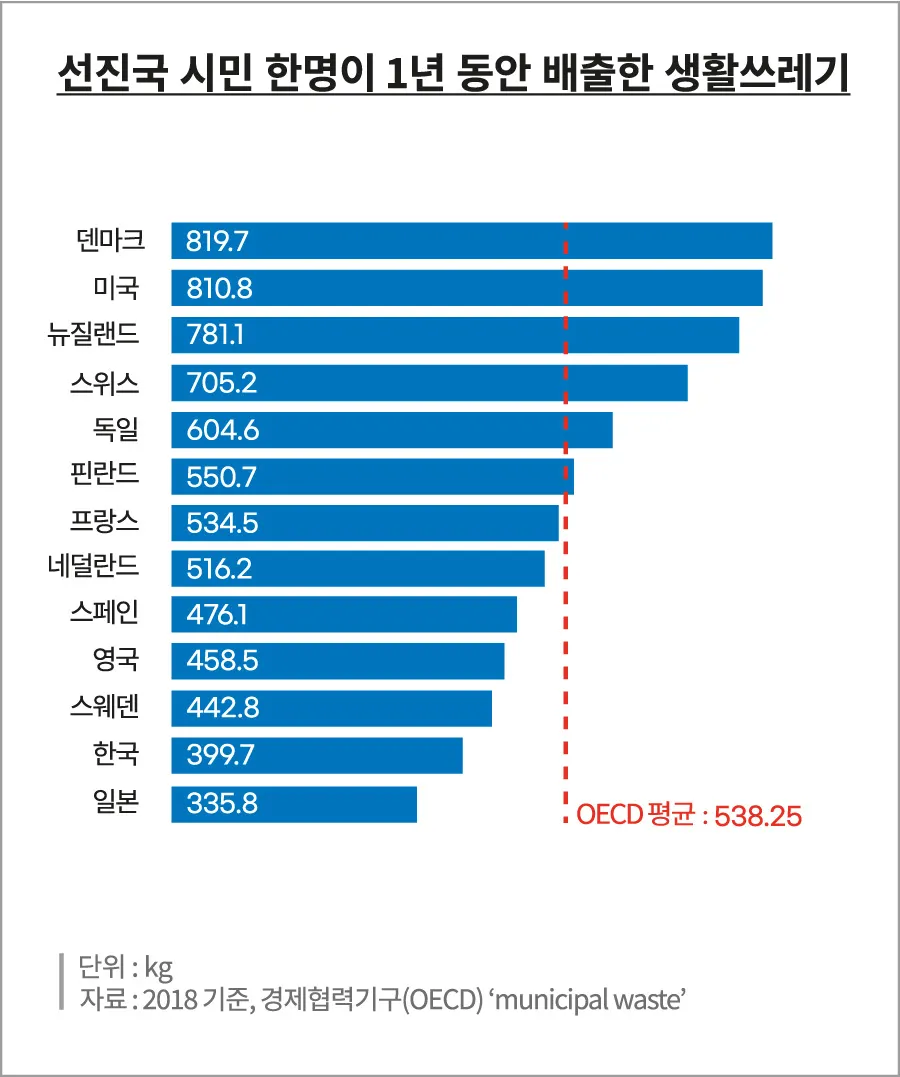 한국은 2019년 기준 연간 1억 8천만t의 쓰레기가 발생했는데, 10년 전에 비해 약 40%나 증가했다. 생활쓰레기는 2019년 기준 1인당 연간 약 399.7㎏을 배출하고 있다. 우리나라의 단위면적당 쓰레기 발생량은 미국의 7배로 적지 않은 양이다. 또한 국내 쓰레기 재활용률은 2019년 기준 86.6%, 생활폐기물 재활용률은 59.7%로 세계 2~3위를 차지하지만 거품을 걷