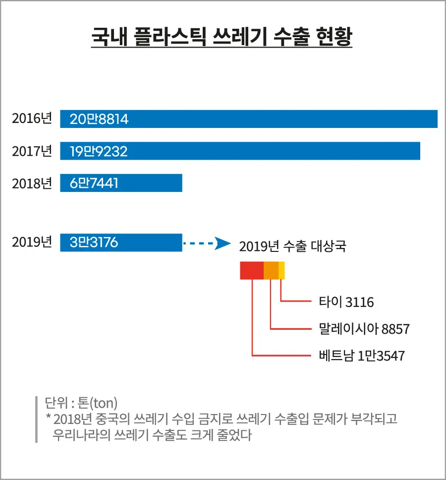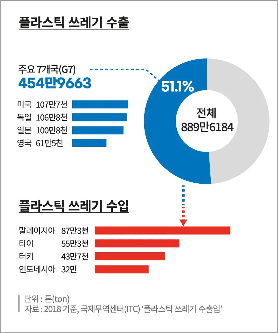 쓰레기를 양산하는 부유국들은 그동안 자국 쓰레기를 주로 중국이나 터키, 동남아시아 등 전 세계의 빈곤국에 떠넘겨 왔다. 그러나 수십 년 동안 전 세계 재활용 폐기물의 절반 가까이를 처리해 왔던 중국이 2018년부터 쓰레기 수입을 금지하고, 2021년 1월부터 폐플라스틱의 수출입을 규제하는 바젤협약 개정안이 발효되면서 전 세계에 비상이 걸렸다. 중국·타이·베트남·말레이시아·필리핀 등으로 향하던 쓰레기는 다시 원산지로 돌아가거나 다른 처리장을 찾아 세계를 떠돌고 있다.