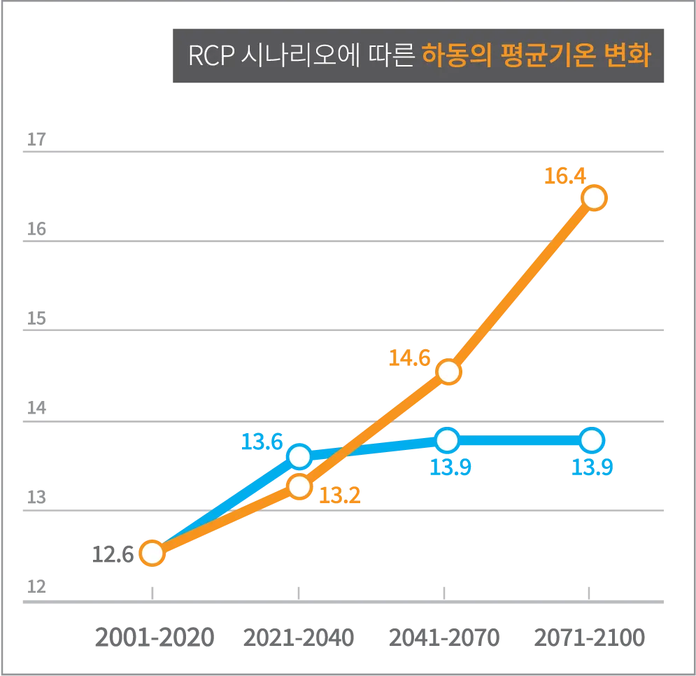 하동이 더워지고 있다. 물론 하동만의 이야기는 아니다. 지난 109년(1912~2020년) 사이에 지구 평균기온이 1.1℃ 상승하였는데, 대한민국은 1.6℃ 상승한 것으로 알려졌다. 모두가 지역발전을 외치고 있는데 이대로라면 하동에서 살아가는 일이 가능하기는 한 것일까?IPCC(기후변화에 관한 정부 간 패널)에서는 2006년 RCP시나리오를 발표하였다. RCP시나리오는 기후위기 대응 정책과 기후변화 간의 관계를 평가하는 것이다. RCP 2.6, 4.5, 6.0, 8.5의 4가지가 있다. 이 가운데 주목할 것은 RCP 2.6과 RCP 8.5이다. RCP 2.6 : 적극적인 기후위기 정책 시행으로 기후 변화를 최소화하는 것 RCP 8.5 : 기후위기 대응을 하지 않고 지금과 같은 경제성장을 지속하는 것 그렇다면 RCP 2.6과 RCP 8.5라는 각각의 경우에 하동의 연평균기온은 얼마나 상승할까?