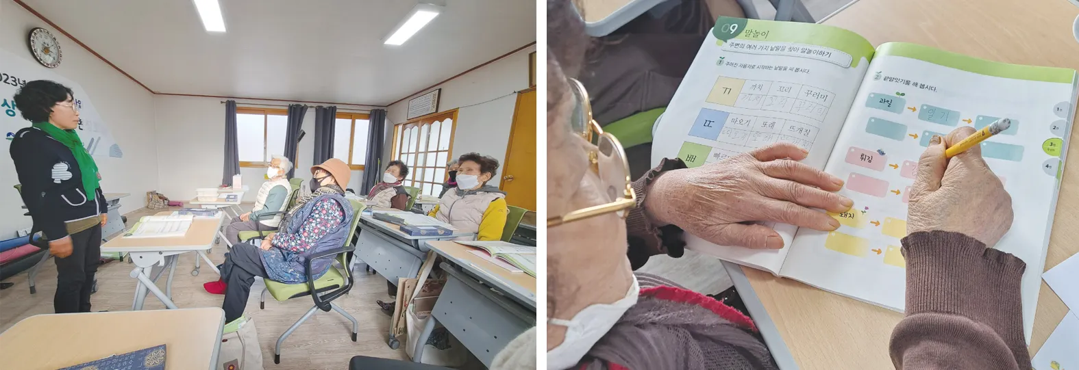 (좌) 상덕마을회관 2층 문해교육 수업현장 , (우) 끝말잇기 숙제에 집중하고 있는 상덕마을 주민