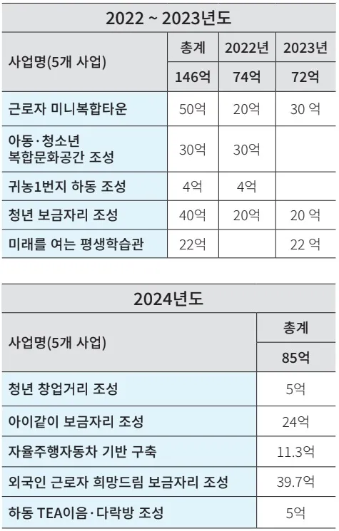 반면 하동군이 기획한 지방소멸대응기금 사업계획을 살펴보면 2022~24년도에 시행예정인 10개의 사업 중 9개(90%)가 신규 인프라 개발사업이다. 지역주민에 대한 수요조사를 충실히 하지 않은 채 외부 컨설팅 업체를 통해 인프라 개발 중심의 사업계획서를 마련한 결과 다른 지자체와의 차별성이나 창의성이 보이지 않는다. 이처럼 주민수요가 정확히 반영되지 않은 인프라 개발사업에만 치중할 경우, ‘예산낭비’와 함께 장기적으로는 ‘유휴시설의 누적’이라는 부정적 결과가 나타날 우려가 있다.([자료2] 참고)