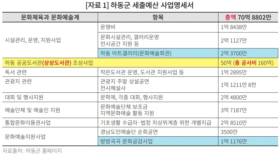 2022년 하동군 문화예술계의 전체 예산은 70억 8802만 원이다. 여기에는 군비, 기금, 도비, 국비 등이 모두 포함되어 있다. 이중 단연 눈에 띄는 것은 전체 예산의 70%를 차지하고 있는 하동 공공도서관(가칭 ‘상상도서관’) 조성사업이다.