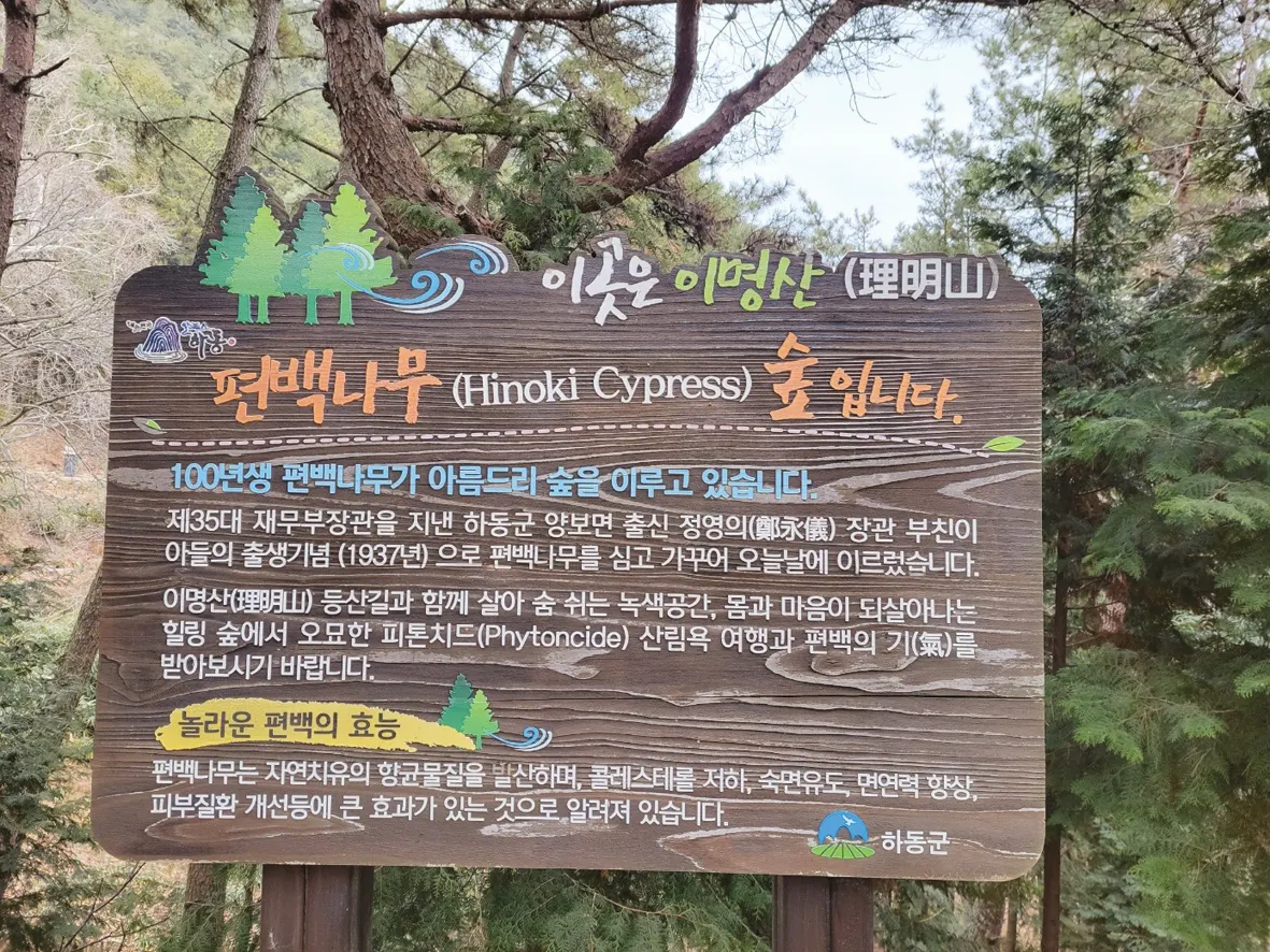2015년 하동군은 이명산 중턱 11만 4,700㎡에 울창한 편백 숲을 조성했다. 원래 이곳 땅 소유주가 아들의 출생기념으로 심은 100년이 넘은 편백 100여 그루와 군에서 추가로 심은 5년생 편백 6,000 그루가 숲을 이루고 있는 가운데 숲길과 편백데크, 생태주차장 등 편의시설을 만들었다. 편백은 자연치유의 항균물질로 알려진 피톤치드가 함유되어 있어 신체의 면역체계를 강화하며 중추신경계를 자극해 스트레스를 낮추고 심신의 안정에 도움을 주는 것으로 전해진다. 위험한 곳에는 데크길이 설치돼 있고 맨발로 걸을 수 있는 둥근 황토돌길도 있어 재미를 더한다.