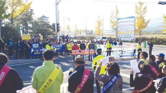 2018년 11월, 하동군청 앞에서 축사신축반대집회를 가진 주민들