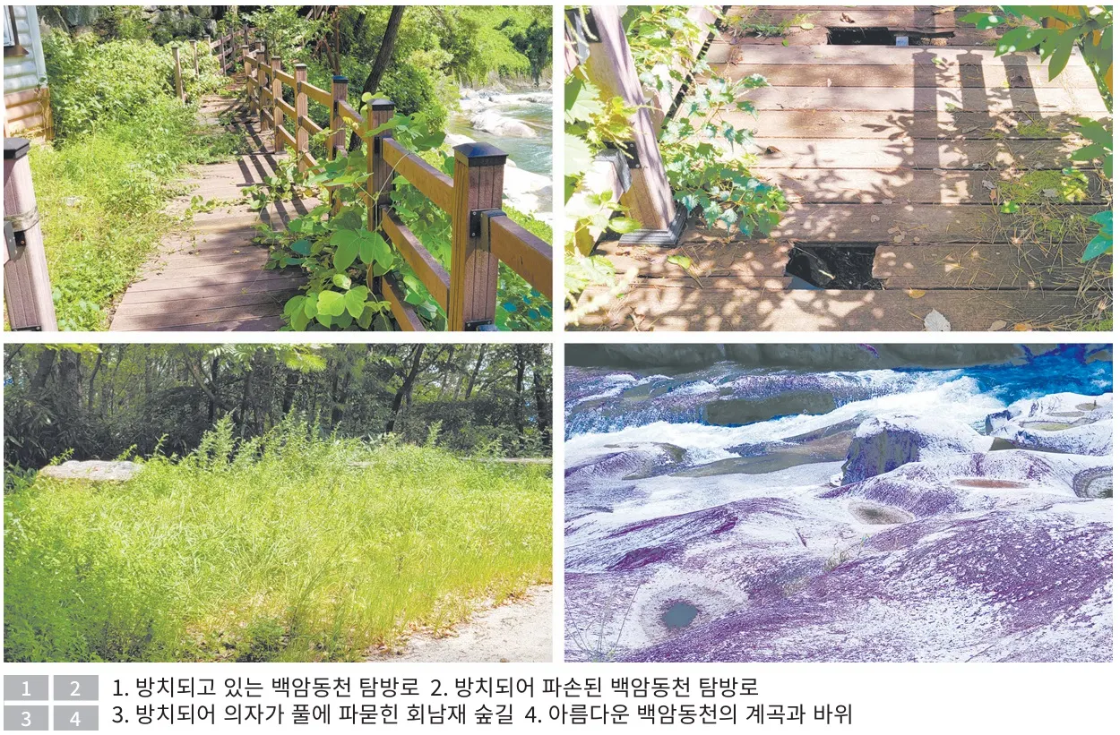 하지만 민선8기에 들어서면서 회남재 숲길은 방치되기 시작했다. 청암면의 명소인 백암동천 탐방로의 상태는 더욱 심각했다. 이곳은 데크길을 이용해 접근할 수 있는데, 데크길 대부분이 관리가 되지 않아 일부 구간에서는 데크가 부서져 낙상의 위험마저 도사리고 있다. 풀에 뒤덮여 의자에는 앉을 수도 없다.