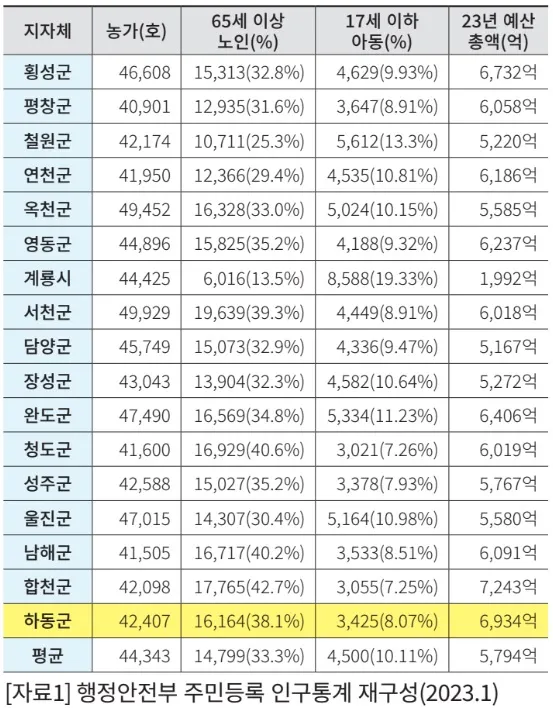 하동군 전체 인구는 17개 지자체 중 11위로 하위권에 속한다. 그러나 65세 이상 노인인구 비율은 5위를 차지할 정도로 높다. 이에 따라 하동군 인구에서 노인층 비율은 17개 지자체 평균인 33.3%보다 4.8%나 높다. 반면에 17세 이하 아동 인구 비율은 14위로 최하위권에 속한다. 따라서 아동층의 비율은 17개 지자체 평균인 10.11%보다 2.04%나 낮다. 소멸위기로 몰리고 있는 유사 규모의 지자체 중에서도 ‘저출산, 고령화’로 인한 소멸 위험이 매우 높은 상황이다.