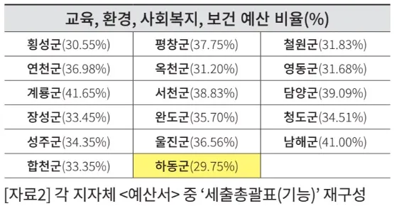 각 지자체가 공개한 2023년 예산서 중 <세출총괄표(기능)>을 통해 하동군 복지관련 예산비율을 살펴보면, 하동군은 17개 지자체 중 꼴찌를 차지하고 있다. 교육 예산의 비율은 0.74%(51억)로 10위, 환경 예산은 9.5%(658억)로 14위, 사회복지 예산은 17.82%(1,235억)로 15위, 보건 예산은 1.69%(117억)로 13위로 나타났다. 그 결과 주민의 삶의 질을 결정하는 교육, 환경, 사회복지, 보건 분야를 총괄한 복지관련 예산의 비율은 29.75%로 17개 지자체 중 유일하게 30%에도 미치지 못한다. 예산 규모는 17개 지자체 중 2위지만, 복지 관련 예산비율은 17개 지자체 중 17위, 즉 꼴찌인 것이다.
