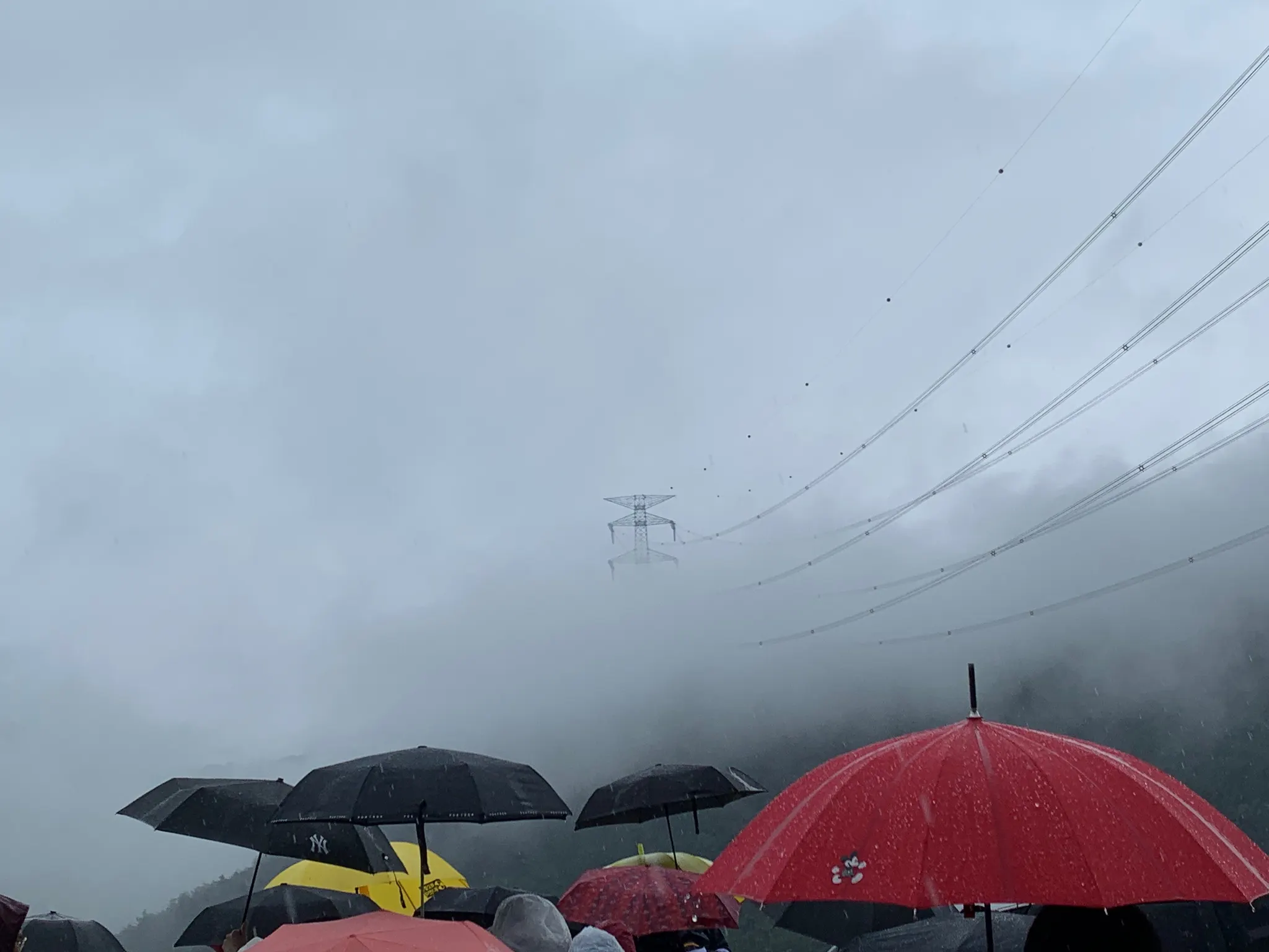 참가자들이 용회마을 102번 송전탑과 연결된 산 위 송전탑을 바라보고 있다.