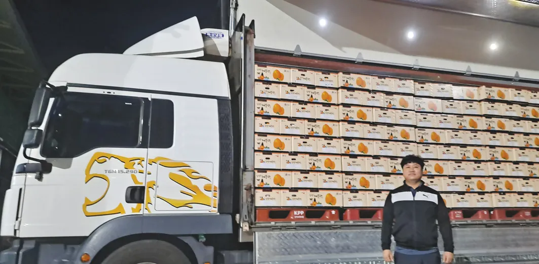 대봉감을 출하하는 트럭 앞에 서있는 화개악양농협 대봉감 수매담당 안성철씨