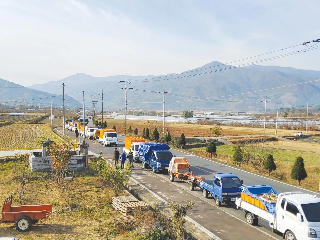농협에서 대봉감 수매를 11월 1일부터 시작했다. 수매 첫날 새벽 5시부터 농협 앞에 감 상자를 실은 트럭들이 줄을 서기 시작하더니 문을 연 9시에는 그 줄이 500미터가 넘었고 오전 내 이어졌다. 그날 오후 농협에선 ‘선별작업이 오래 걸려 수매를 잠정 중단’한다고 발표했다. 그러다가 5일 후 2번째 수매를 했는데, 이 때는 그 전날부터 트럭들이 1킬로미터 정도 줄을 섰다. 500미터 전진하는 데 5시간이 걸렸다. 사람들은 하루 일을 포기하고 차례를 기다렸다. 농협창고도 가득 찼다. 농민들도 농협도 정신이 하나도 없었다.