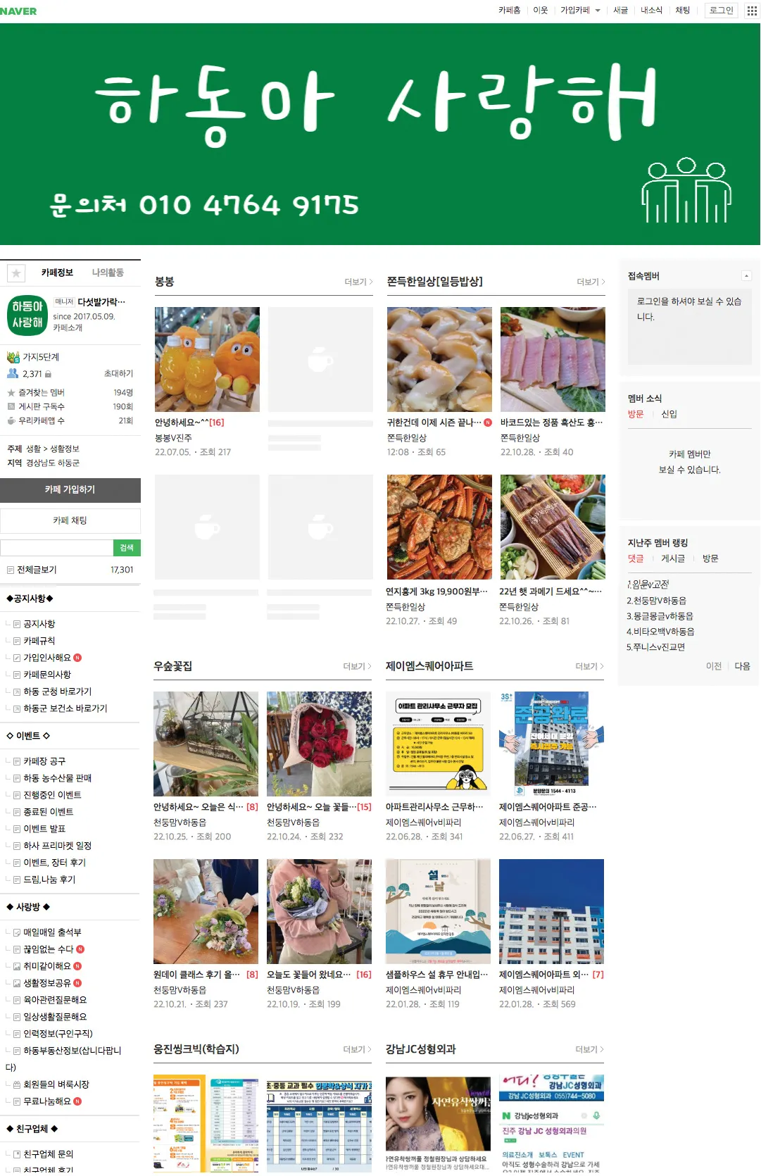 ‘하동아 사랑해’는 맘카페는 아니고 지역소통카페로서 하동군민이면 누구나 가입할 수 있어요. 단 가입할 때는 닉네임 뒤에 지역명을 넣는 규칙이 있어요. 중고용품 거래를 한다든가 오프라인 모임이 있을 때 함께 차를 타기 위함입니다.
