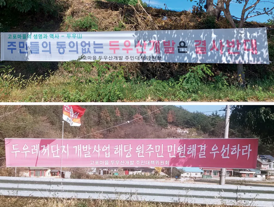 현재 고포마을에서는 이주대상이 된 11가구를 중심으로 고포마을 주민대책위원회를 결성하여 보상 및 이주대책을 논의하고 있고, 금성면 차원에서는 이장들을 중심으로 금성면 대책위원회가 구성되어 활동하고 있다. 하동군과 시행사인 두우레저개발(주)는 양 대책위를 중심으로 한 주민들의 목소리에 귀기울여 갈사·대송 산단의 뼈아픈 실패를 반복하지 않도록 노력해야 할 것이다. 고포마을 주민 A씨의 말이다. “두우산 개발이 결국 골프장 건설만을 위한 게 되면 안 된다. 지역주민의 피해방지나 지역주민 동반성장의 청사진이 있어야 한다. 80만 평의 산림을 훼손하면서, 이주민이나 관광객만을 위한 개발을 하는 건 절대 안 된다”
